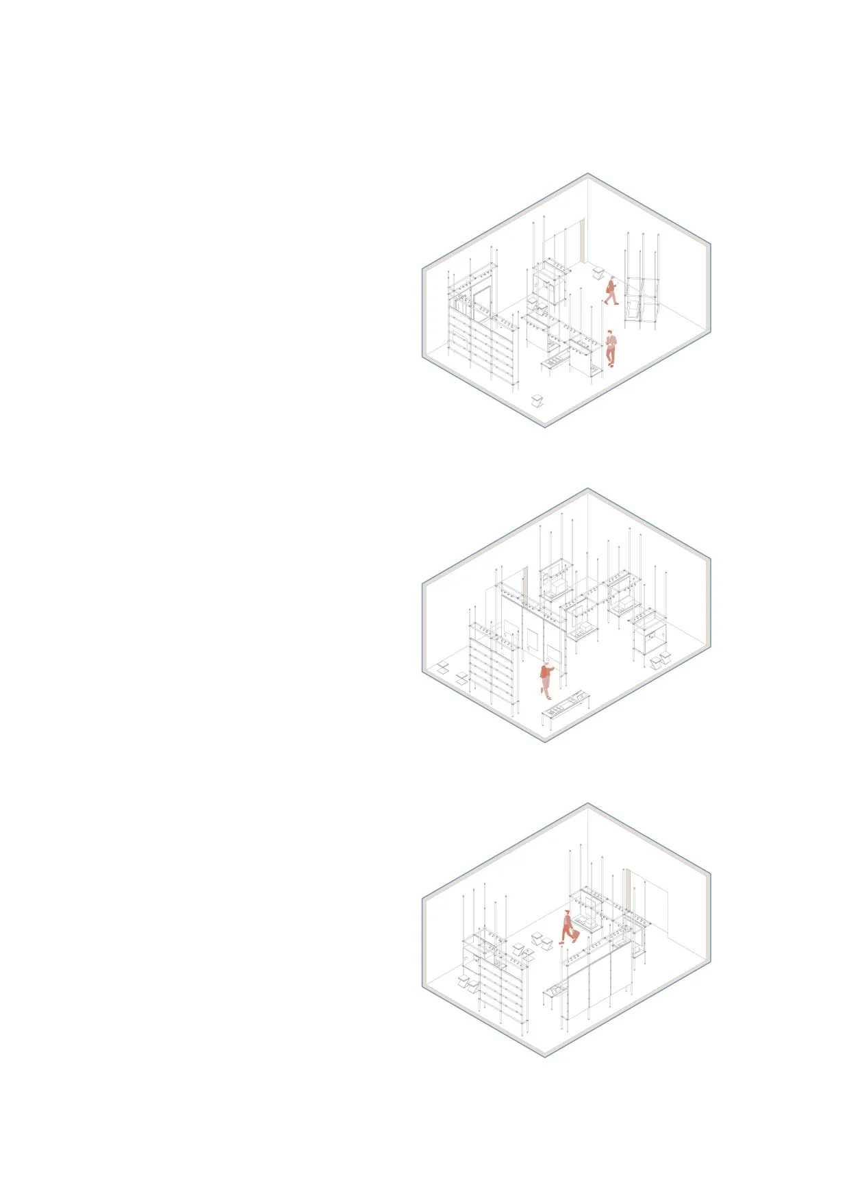 each axiometric on the side presents a possibility of arrangement for different spaces and are assembled with the aid of connectors: